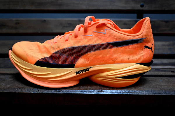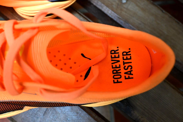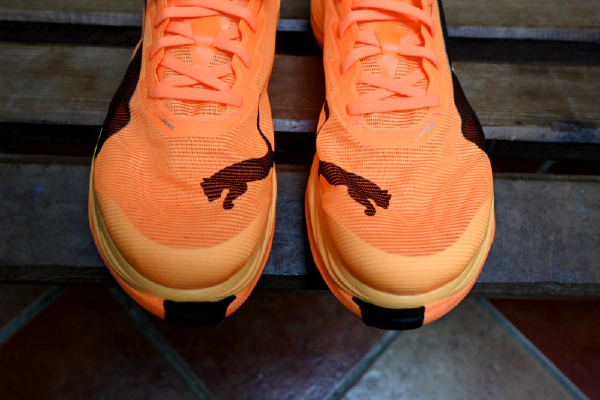 The shoe looks futuristic, aggressive, and highly distinctive. The “Heat Fire-Sun Stream” colorway that I have has a high-energy aesthetic, with vibrant orange and gold upper contrasted by black accents. The black Puma logo pops prominently off the side of the shoe, while the Puma Cat logo appears throughout the silhouette. The minimalist, almost transparent Ultraweave upper, the distinct decoupled midsole, and the visible carbon plate all contribute to the technical and aggressive look. “FOREVER. FASTER.” is written on the insoles, finally makes sense.